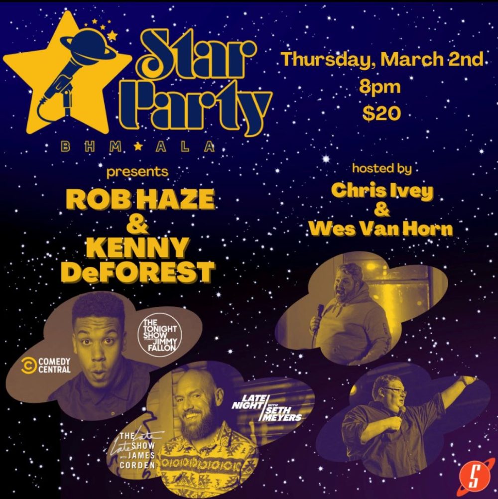 Chris Ivey and Wes Van Horn have brought something special to Birmingham with Star Party. This series, which takes place at Saturn, brings rising national comedians into town alongside Magic City favorites. This month’s edition features Rob Haze and Kenny DeForest, and is sure to be a good time.