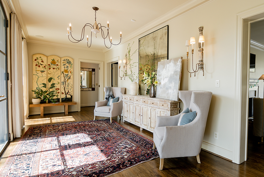 One of the reasons we fell in love with this house was the neighborhood. The houses are situated further back on spacious lots that show off larger front yards and beautiful mature trees. We wanted to capitalize on this feature by switching the front doors to iron and glass so that the front yard became something we could see throughout the day. Growing up in Southern California, the outdoors and indoors tend to merge together, so I am always looking for ways to bring the outside in. I also love the contrast of the industrial iron and glass of the new doors with the overall traditional style of the home. Our designer, Kate Hartman, designed the doors and a local metal fabricator, Iron Horse Metalworks, built and installed the doors with our Contractor Cross Building Co. We love the open flow from the outdoors to the foyer and how it is reflected back by the large distressed mirror by a local company called Mirror-tique. The artwork on the console is by our favorite local artist, Emily Debuys. The paneled screen on the other wall was passed down to us from my husband’s parents.