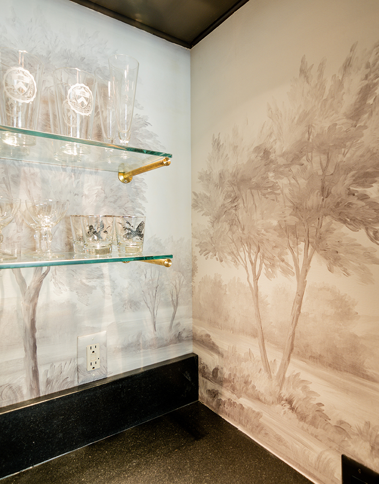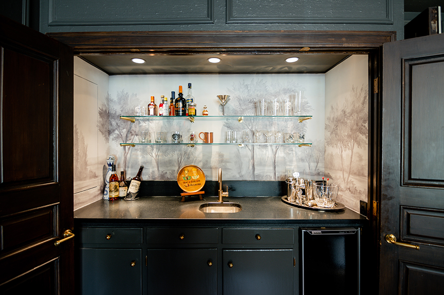 The wet bar in the den was in the house when we bought it and we love how it is somewhat of a surprise to discover. When the doors are closed, it is easily overlooked and assumed to be a closet. It is always fun to pull them open and turn on the lighting, which instantly transforms the entire room. There is even a (somewhat) hidden door to a liquor cabinet. We recently added the beautiful wallpaper and glass shelves to lighten up the space and add more contrast and visual interest.