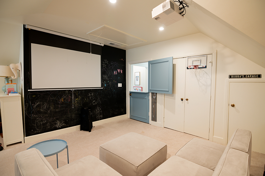 We wanted to create a shared space for the kids to play, read, watch TV, draw, etc so we finished some attic space and popped in a dormer to create a playroom. We have 2 boys and 2 girls that range from 3-10 years old so our playroom contains a mix of items that appeal to their diverse interests. The chalkboard wall with a pull-down projector screen is probably their favorite part of the room. ¶ The playroom door is a neat feature. We built a Dutch door, added a shelf and painted it a fun accent color. It allows for us to keep an eye on what’s happening in the playroom while keeping small kids and dogs contained on either side – not to mention a fun “storefront” when the kids hold movie night or want to charge us for admission to one of their shows. They also love to use it as a pretend drive up window. We spend so much time in our homes – we deserve to make them something we love being in.