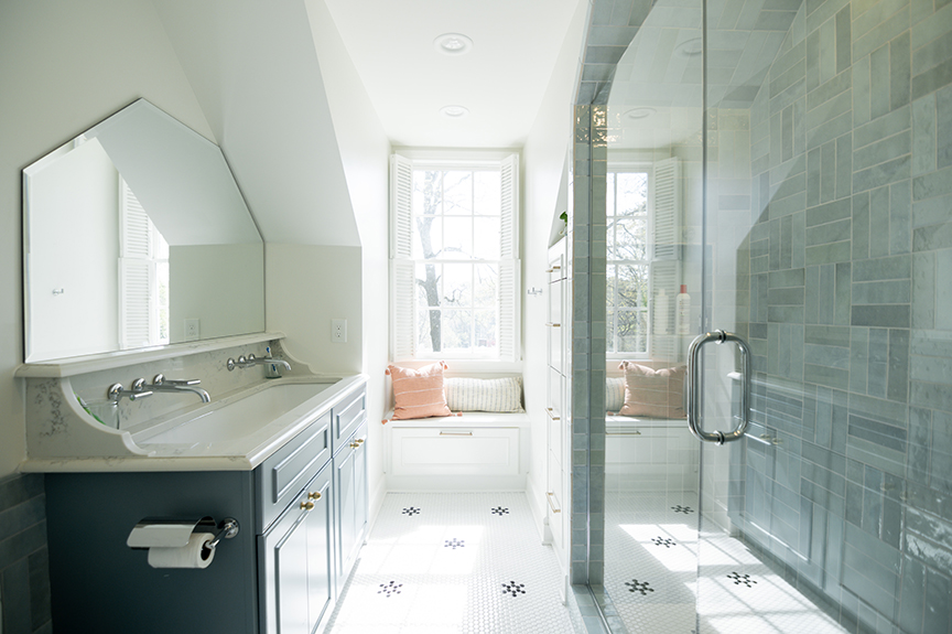 When we discovered a leak in the plumbing in the boys’ bathroom, we decided to take advantage of having to open up several walls and go for a full remodel. With two growing boys that will likely be tall (their dad is 6’7”!), we decided to pull out the bathtub and replace it with a floor to ceiling shower to give them more space. We converted a linen closet to drawers that are flush to the wall, which makes the space infinitely more functional and organized. We built the double trough sink countertop finishing out the space.
