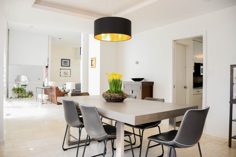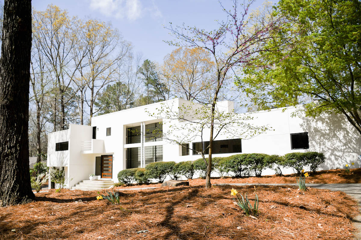 In 2019, after completely renovating a more traditional house in Crestline over twelve years, the Calmas found themselves out of projects to satisfy their creative impulses. A unique contemporary home in the Mountain Brook suburb of Dunbarton presented an opportunity they couldn’t resist. Built in the International style of LeCourbusier, part of mid-twentieth century Bauhaus movement, the home is a squared white stucco-clad L-shaped dwelling with expansive common spaces and soaring windows.
