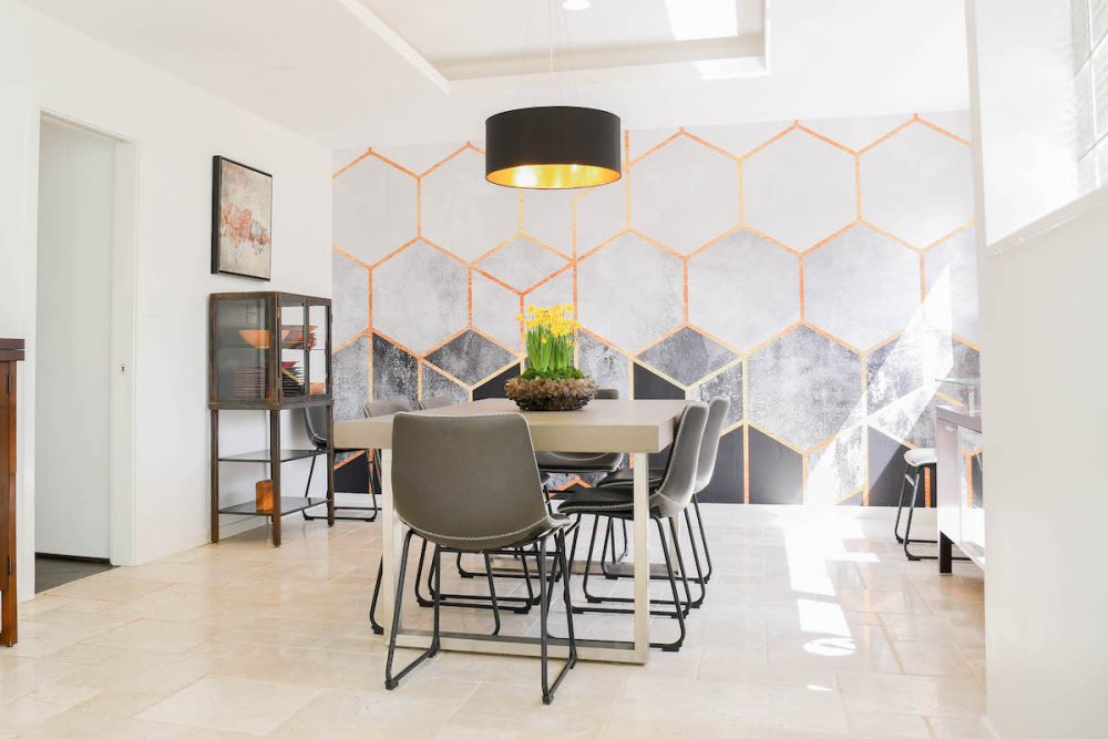 Guests step into the home through a heavy, custom wood door into an entryway with a unique office nook above that opens to a balcony above. The main level features a big open den with two-story ceilings. Behind the marble tile covered fireplace is a spacious dining room that features a distinctive geometric mural chosen by the couple using happywall.com. Behind the dining area is the kitchen—the next project on the couple’s list.
