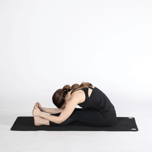 - Sit upright with the spine and head aligned, the legs bent on each side in front of the body, and the soles of the feet facing each other. Place the hands on the tops of the feet.