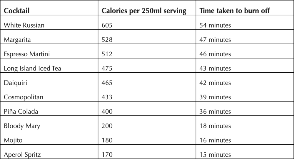 The cocktail which would take the longest to burn off is the White Russian. The delightfully rich vodka and coffee liqueur cocktail is widely loved, but the added cream makes it 605 calories per serving, meaning you would need to run for 54 minutes to burn it off.