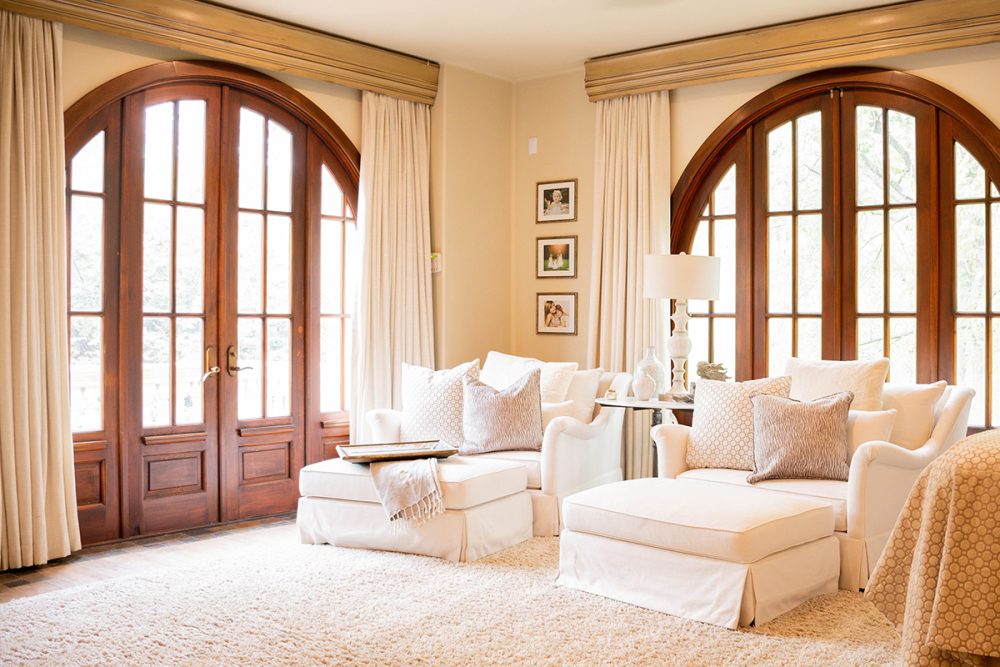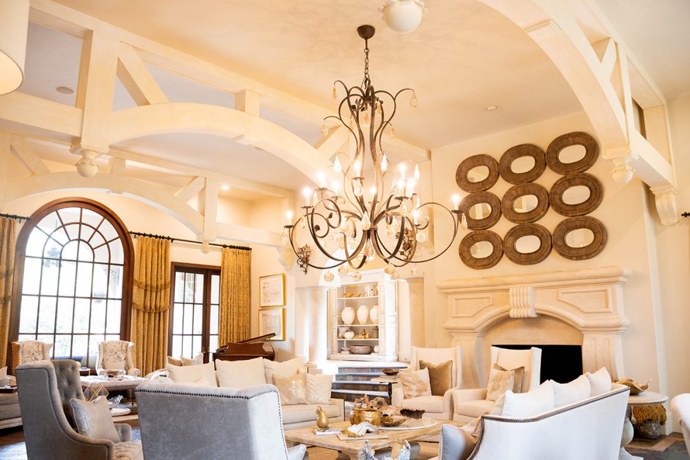 “The original owners did a wonderful job building the house with a distinct European influence. From the first time I walked into the foyer and saw the cupola and spiral, iron staircase I was drawn to the home,” recalls Ashley. And indeed, the foyer provides a stunning entrance to a home that is both grand in scale but is also comfortable and welcoming. The great room, with its large beams, imported chandelier, and refinished bar, has been the entertaining heart of the house with baby showers, cocktail hours, and parties over the years. From the great room, guests can easily move to an expansive back porch and yard complete with a pool. “My girls love the pool and have turned the column planters into diving boards!”