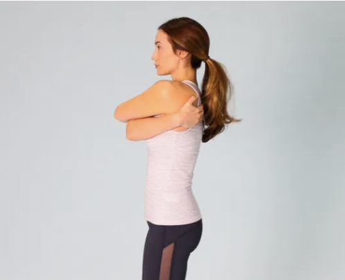 - Cross one arm over the other arm at the elbows, reach over opposite shoulders and grab the backs of the shoulders.
