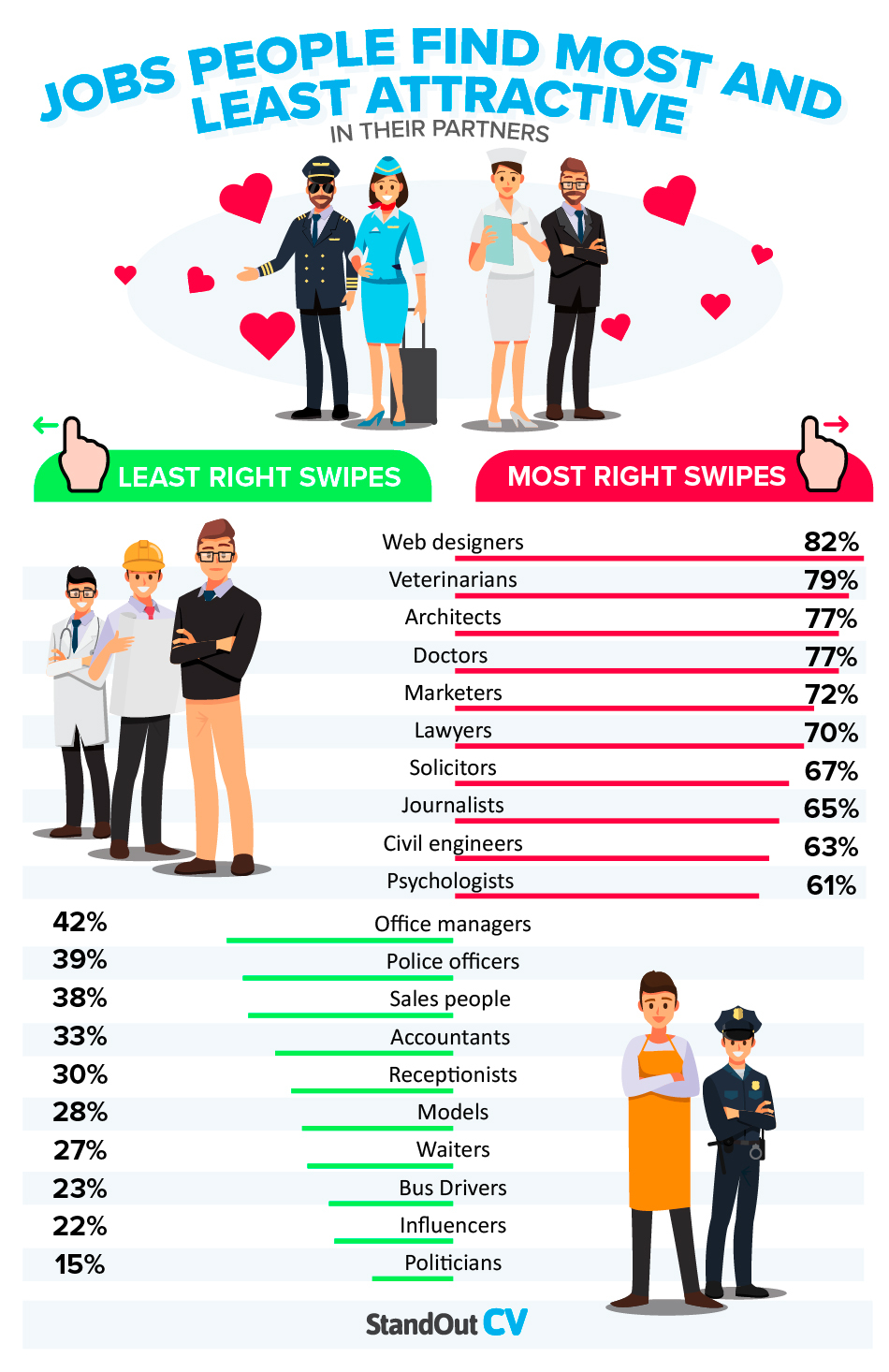 - The second most attractive job is vet, with 79% of people swiped right for profiles featuring this job title.